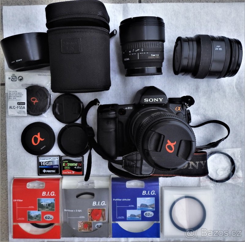 Profesionální fotoaparát Sony Alpha 850 s bohatým příslušenstvím.Původní cena - ani se neptejte. Jen širokoúhlý objektiv sigma stále stojí víc jak 17.000 Kč. Vše plně funkční. Cena 27.000 Kč.