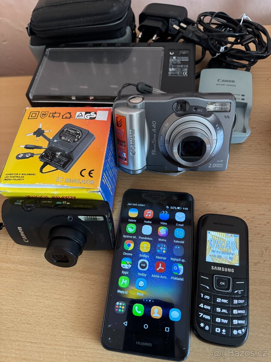 Prodám fotoaparát Canon IXUS 300HS, Canon Power Shot A40, Universální adaptér, Mobil Huawei, Samsung, Nabíječku universální baterií.Vše plně funkční. Vše za 3000 Kč. Možnost i jednotlivě. Jen osobní předání.