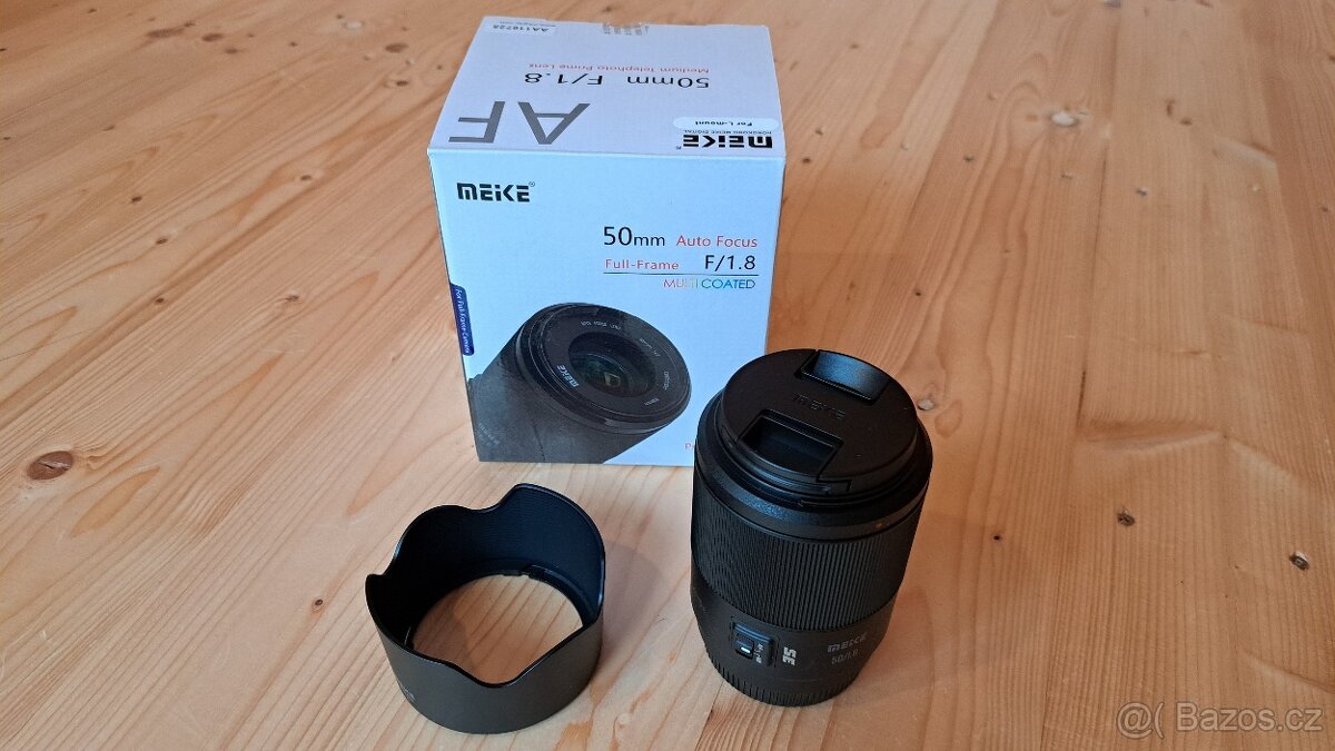 Prodán objektiv Meike 50 mm f/1,8 AF (L Mount), vhodný pro Leica/Panasonic. Objektiv je nový, koupený v březnu 2025, v záruce.
