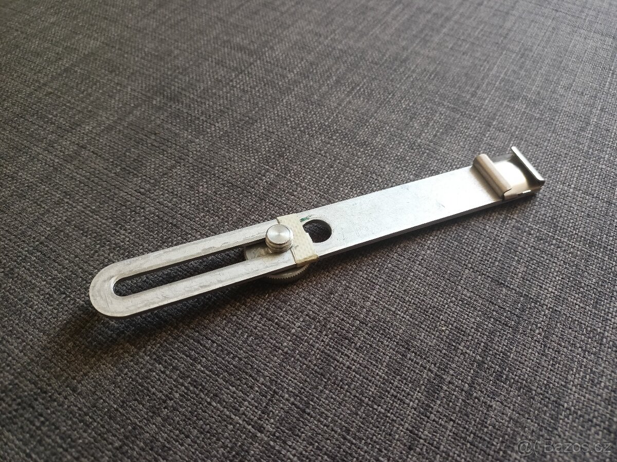 Starý, asi podomácku vyráběný nástavec na blesk, ideálně k použití s fotoaparátem, který sám nenabízí možnost uchycení blesku. Celková délka 17 cm, šířka 2 cm a průměr závitu cca 1 cm.