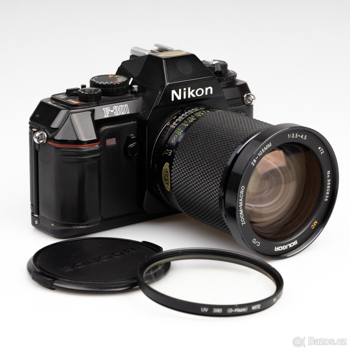 Plně funkční kinofilmová zrcadlovka Nikon F-301 s objektivem MC Soligor Zoom+Macro 28-105mm f/3,5-4,5. Bajonet Nikon F AIS. Včetně krytky a UV filtr 72mm.