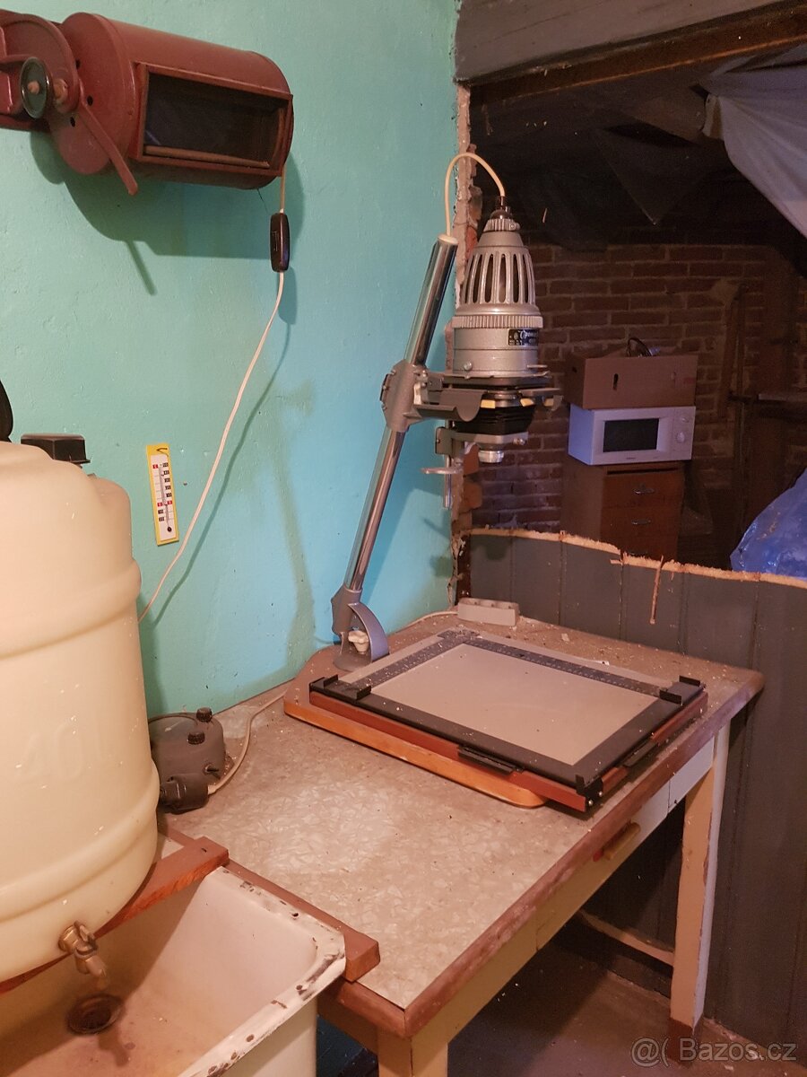 Prodám vybavení staré fotokomory, zvětšovák, pipety, skleněné misky atd.