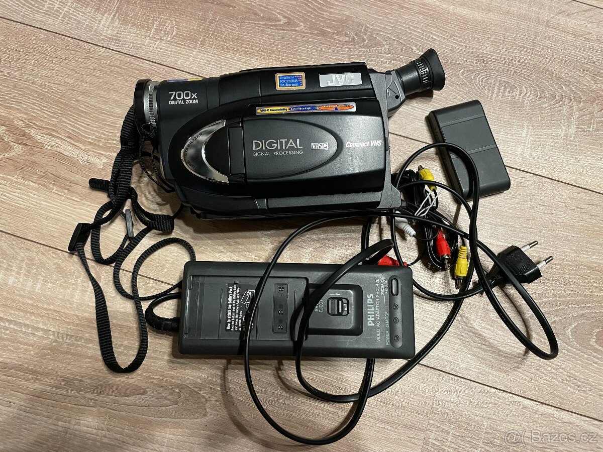 Plně funkční VHSC kamera. Nahrávání a přehrávání na kazetu funguje bez vad. Testováno 5 minutovým záznamem a digitalizací. Má i vestavěné světlo! Full set kamera, baterie, nabíječka (je na ní napsáno Philip, ale je plně kompatibilní, dříve někteří výrobci sdílely typy baterii), video kabely. Baterie celkem ještě drží. Pokud by jste sháněli i brašnu, koukněte do mích dalších nabídek.