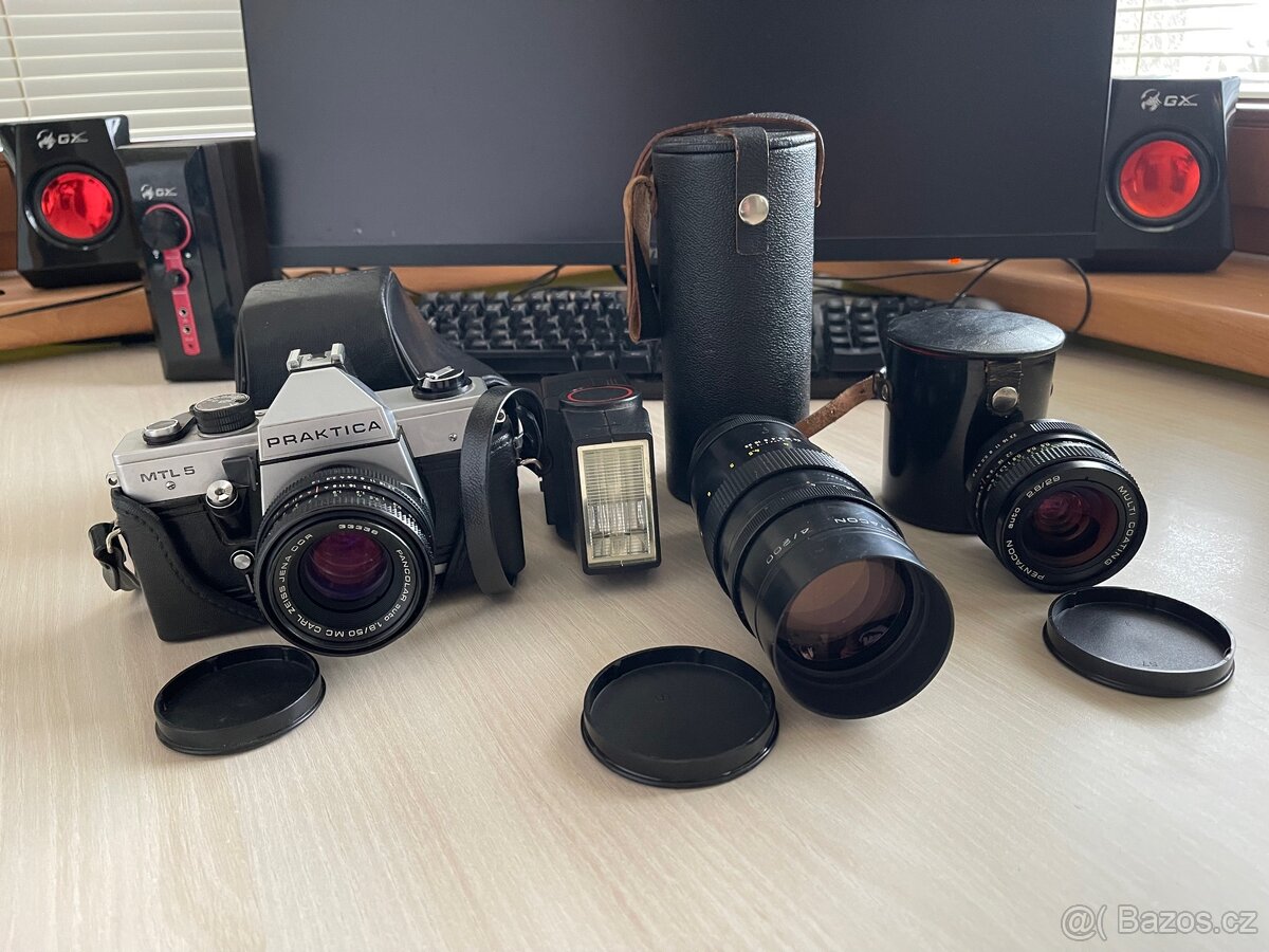 Praktica MTL 5 + příslušenství (blesk, dva objektivy, plno filmů) Plně funkční dokonalý stav.