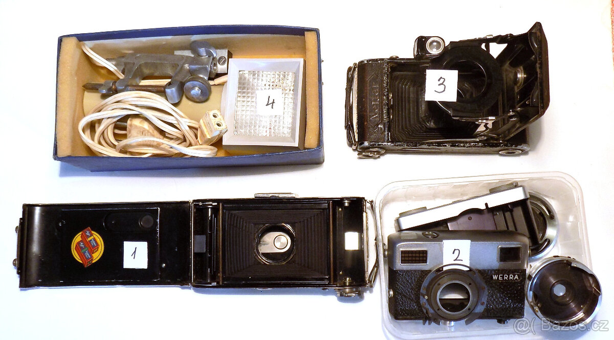 2 x kostra fotoaparátů 6x9, měchy nepoškozené. Díly fotoaparátu Werra a starožitný blesk nefunkční. Všechno za 500,-Kč, jednotlivě dohodou. Posílám poštou na adresu 100,-Kč.Platba předem.