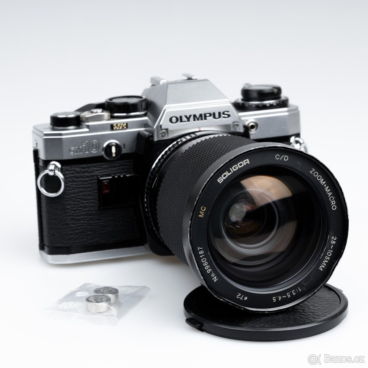 Plně automatický kinofilmový fotoaparát Olympus OM-10. Funkční, měří správně, závěrka funguje jak má. V hledáčku ale nespolehlivě ukazuje LED. Objektiv je lehce ťuklý. Konkrétně se jedná o Soligor C/D Zoom Macro 28-105mm 3,5-4,5