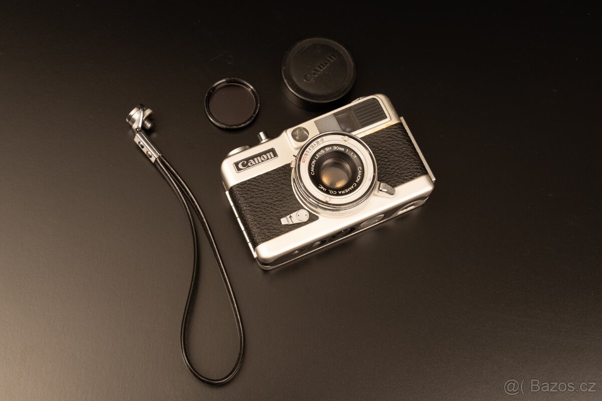 Prodám půlformát Canon Demi EE 17. Foťák jsem zkoušel s filmem a všechno funguje. Optika je čistá, je na tom nasazený i UV filtr. Jediná vada na kráse je popraskaný kryt měření (viz foto), ale expozimetr měří normálně, na funkci to nemá vliv. Jinak stav odpovídá stáří.