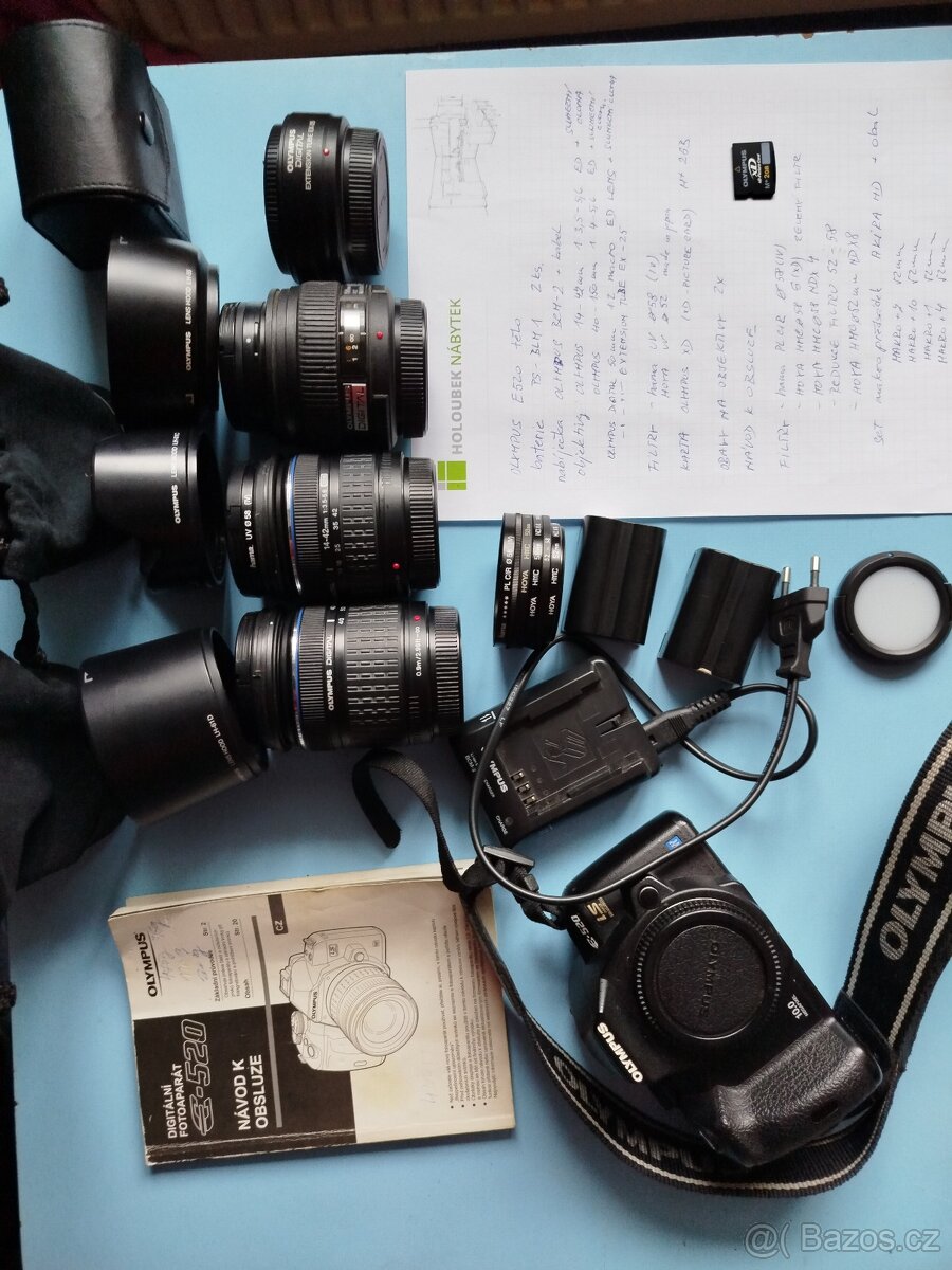 Olympus E520 - [28.1. 2026]Prodám funkční Olympus E520 i s příslušenstvím, tři objektivy+ sluneční clony, 40-150mm, 14-42mm, externí blesk, dvě baterie, nabíječka, návod