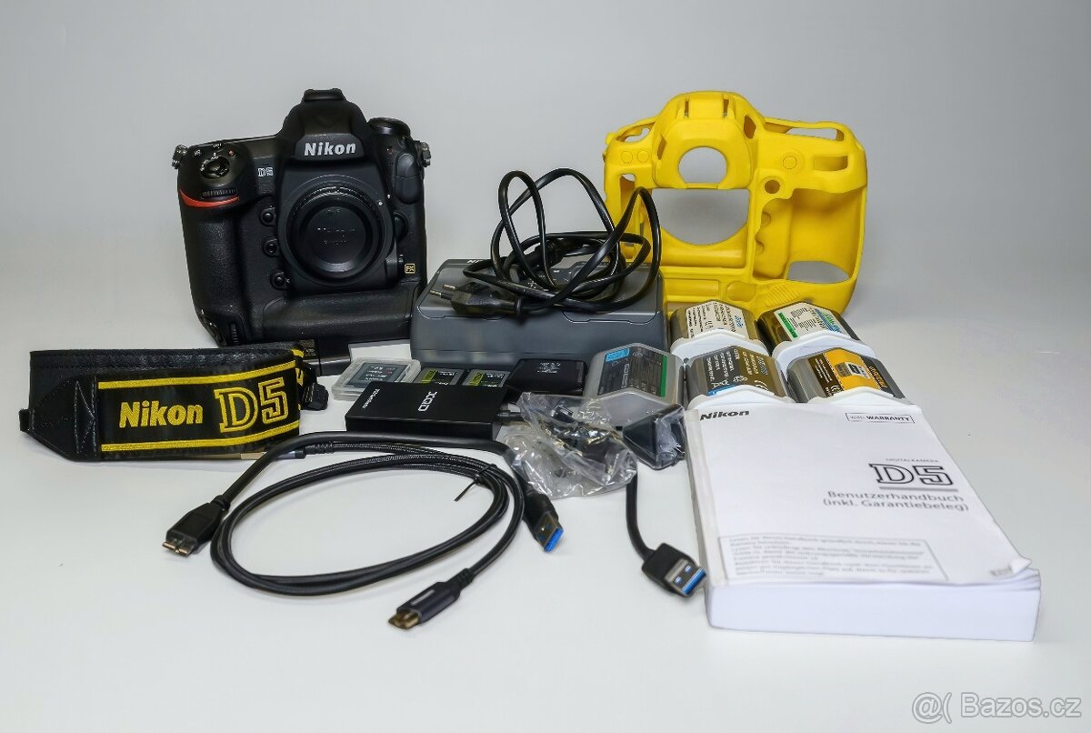 NIKON D5 - camerashuttercount 75000 - [24.2. 2026]Prodám NIKON D5 v perfektním stavu. Závěrka má nacvakáno necelých 75000 převážně v interiéru. Nabíječka, popruh i kabeláž jsou součástí této nabídky. Jako bonus přidám XQD 64GB kartu včetně čtečky karet a dvě baterie.
