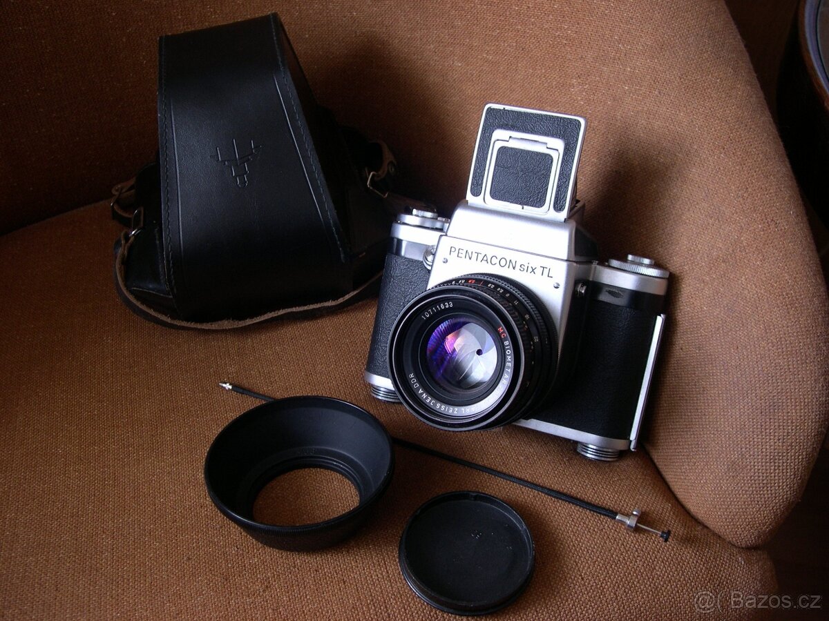 Funkční Pentacon six TL 6*6 cm, Biometar 2,8/80 MC, příslušenství.Drobná kosmetika nemá na foto žádný vliv. Malo používané.Krytka, ohebná spušŤ , brašna.
