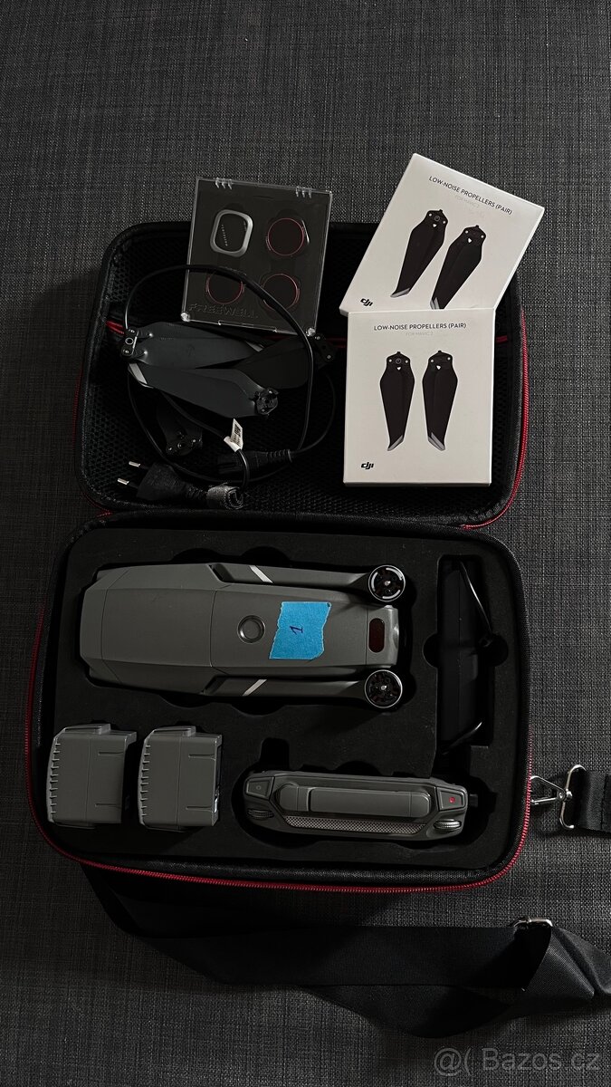 Součástí jsou 2× baterie, náhradní vrtule, nabíječka + autonabíječka, kufr a ND filtry, které pomáhají zlepšit kvalitu videa a fotografií za slunečného počasí.