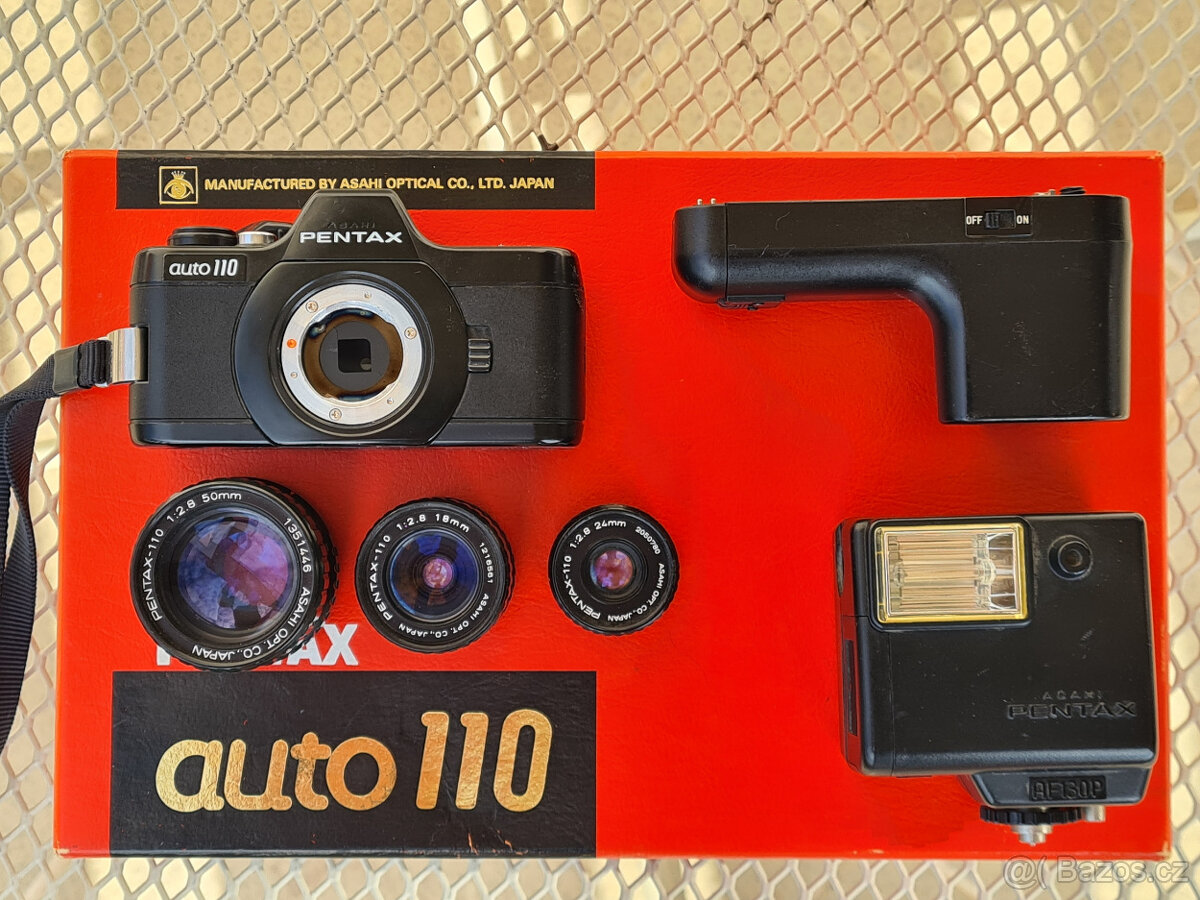 Na prodej je PENTAX Auto 110, kompletni set plus krabicka ve moc dobrem stavu. Motor winder a blesk jsou funkcni.Objektivy jsou cisty.